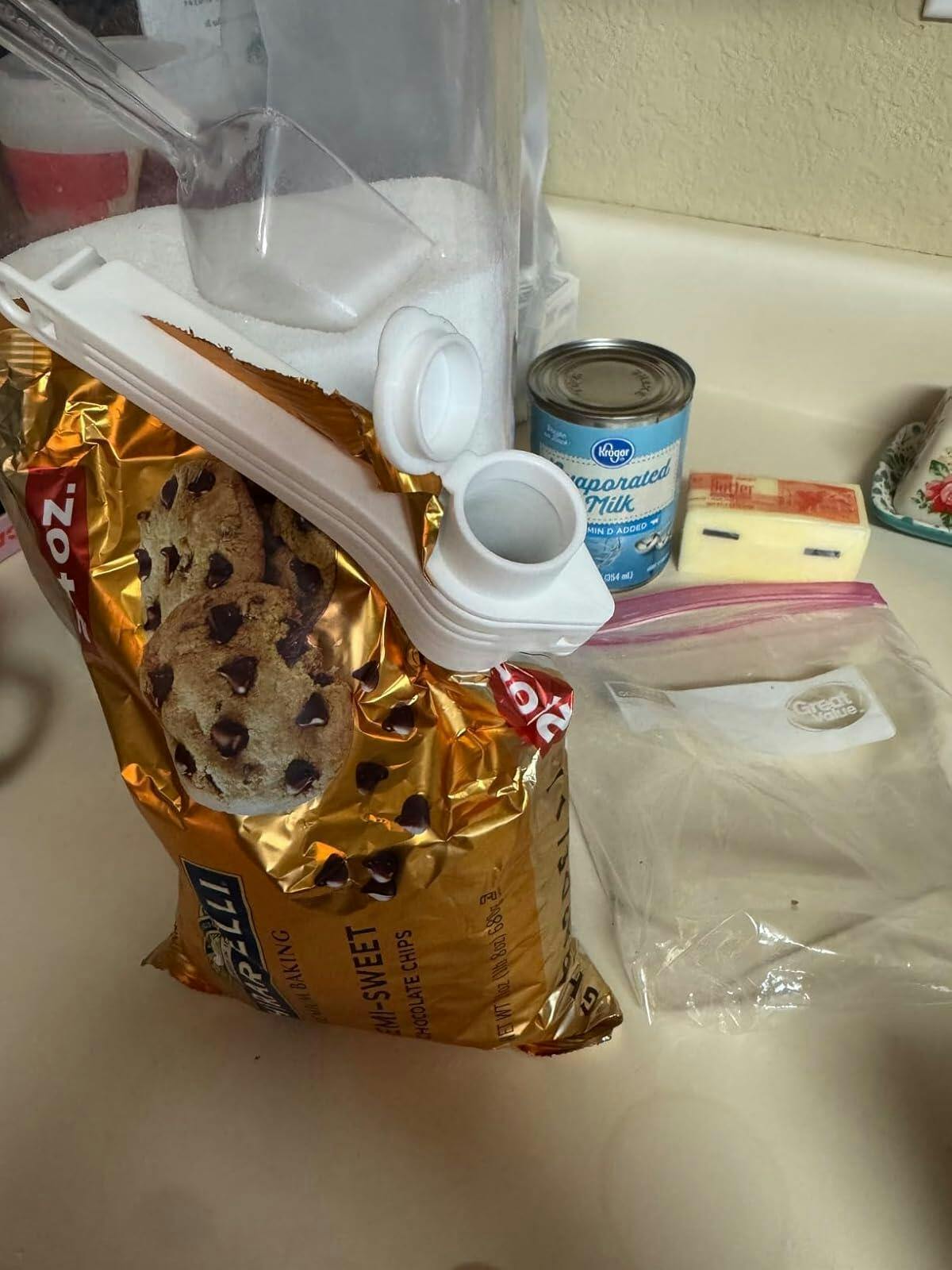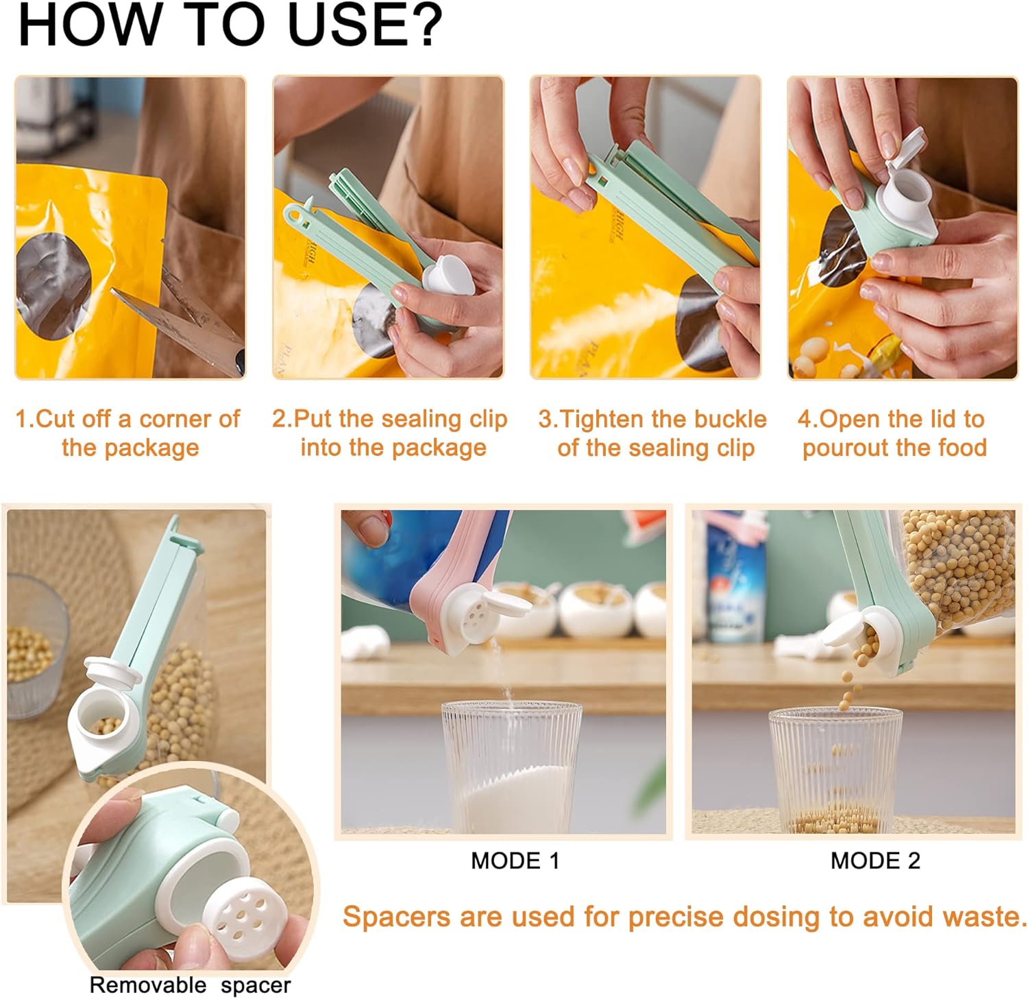 👌 Simple to Use: Stick it onto any plastic or paper bag, clamp the clip, seal it, and open the top lid whenever you want to pour. Works great for snacks, popcorn, spices, oats, cereal, flour, and more.